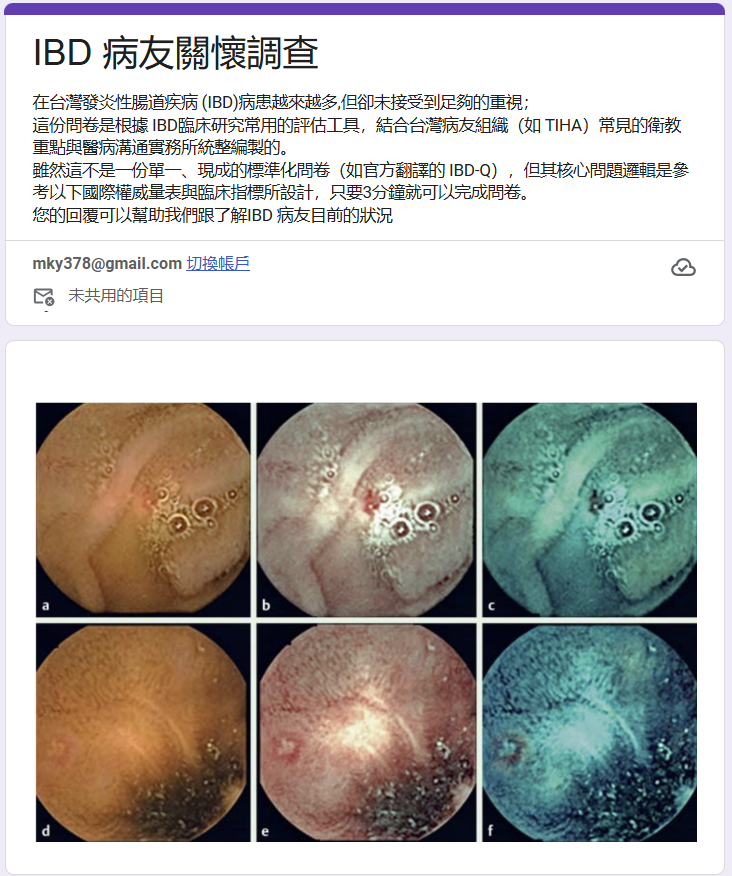 隨著飲食西化與生活型態改變,發炎性腸道疾病 (包括克隆氏症與潰瘍性結腸炎) 病友正快速增加; 截至115年1月台灣有效領證人數在克隆氏症已達2757人,潰瘍性結腸炎更高達5977人。 發炎性腸道疾病是一個很重要的健康問題,它不只困擾病友更會拖累整個家庭;我們需要大家一起來關心這個健康議題。 如果您有一點點空檔,不管您是病人或家屬或關心這個疾病的人, 麻煩您可以幫忙填以下問卷,讓我們更了解台灣發炎性腸道疾病的現況,謝謝您。 (病友或健康朋友都可以幫忙填)